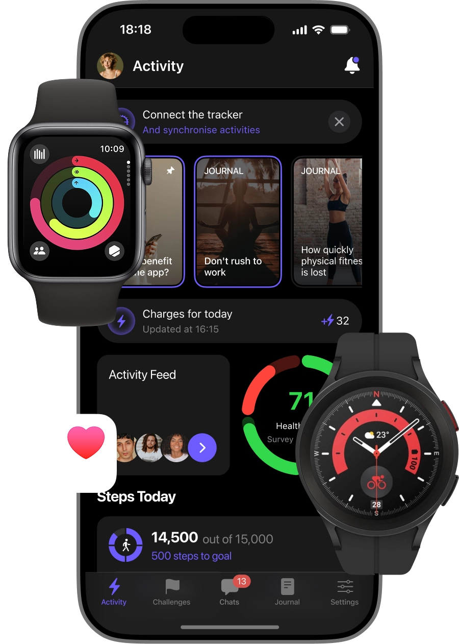 Synchronization via Apple Health and Health Connect fitness devices: Samsung, Xiaomi, Amazfit, Fitbit.